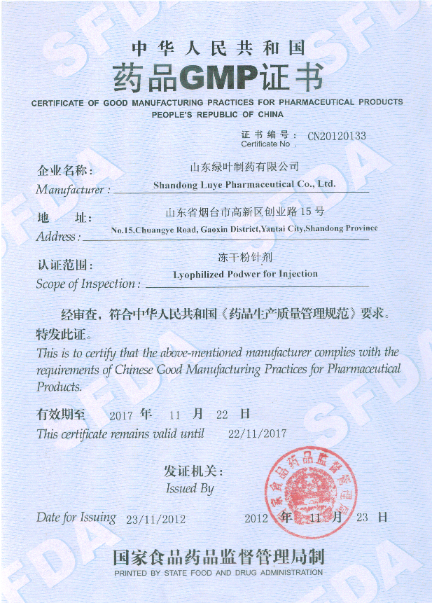 恭喜我公司合作的山東綠葉制藥有限公司榮獲GMP證書!
