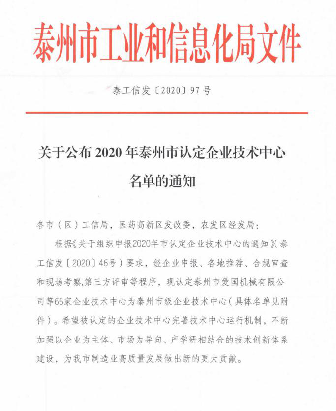 接泰州市工信局文件通知,經(jīng)企業(yè)申報、各地推薦、合規(guī)審查和現(xiàn)場考察,第三方評定等相關(guān)程序,公布認定2020年泰州市企業(yè)技術(shù)中心名單。江蘇捷順機電設(shè)備有限公司通過審核認定,位列其中。